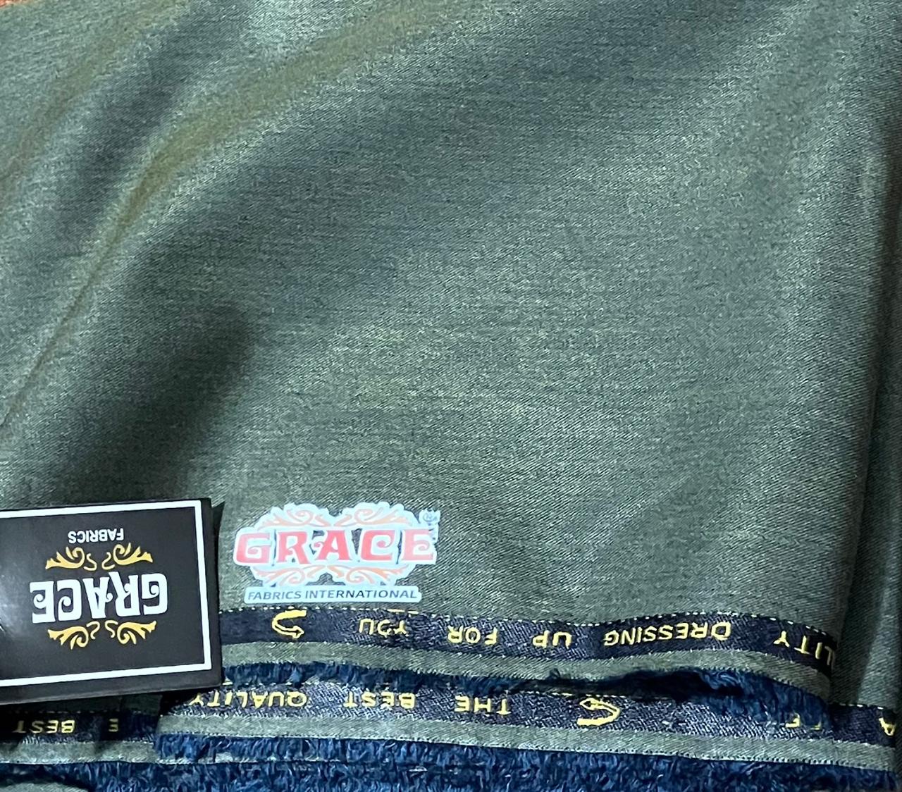 This is a piece of premium suiting or dress fabric from the brand GRACE FABRICS INTERNATIONAL.